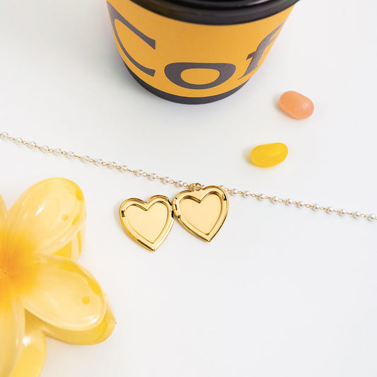 18K Gold Flower Heart Locket Pendant Pearl Chain Necklace