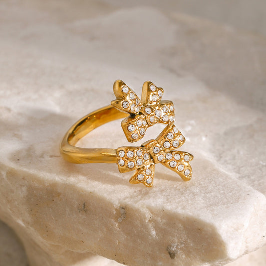 18K Gold Ribboned Elegance Bow Heart Statement Ring