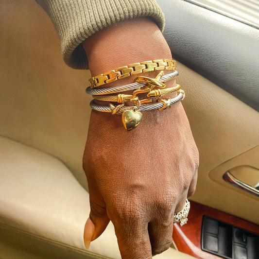 18K Gold Safety Pin Tennis Double Chain Heart Bangle Bracelet Stack