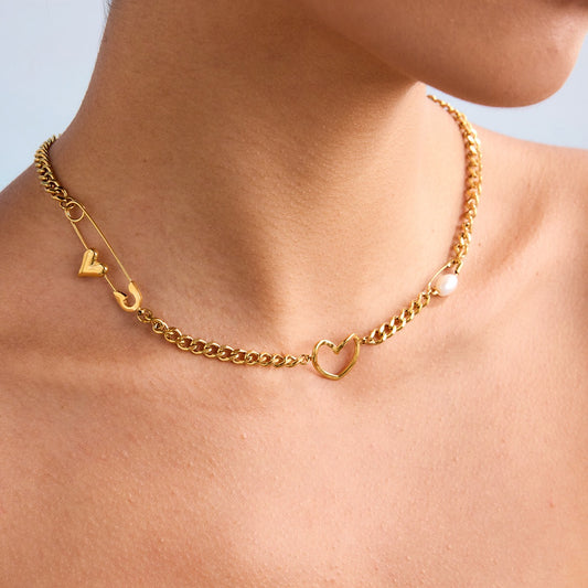 18K Gold Heart Safety Pin Pearl Cuban Curb Chain Necklace