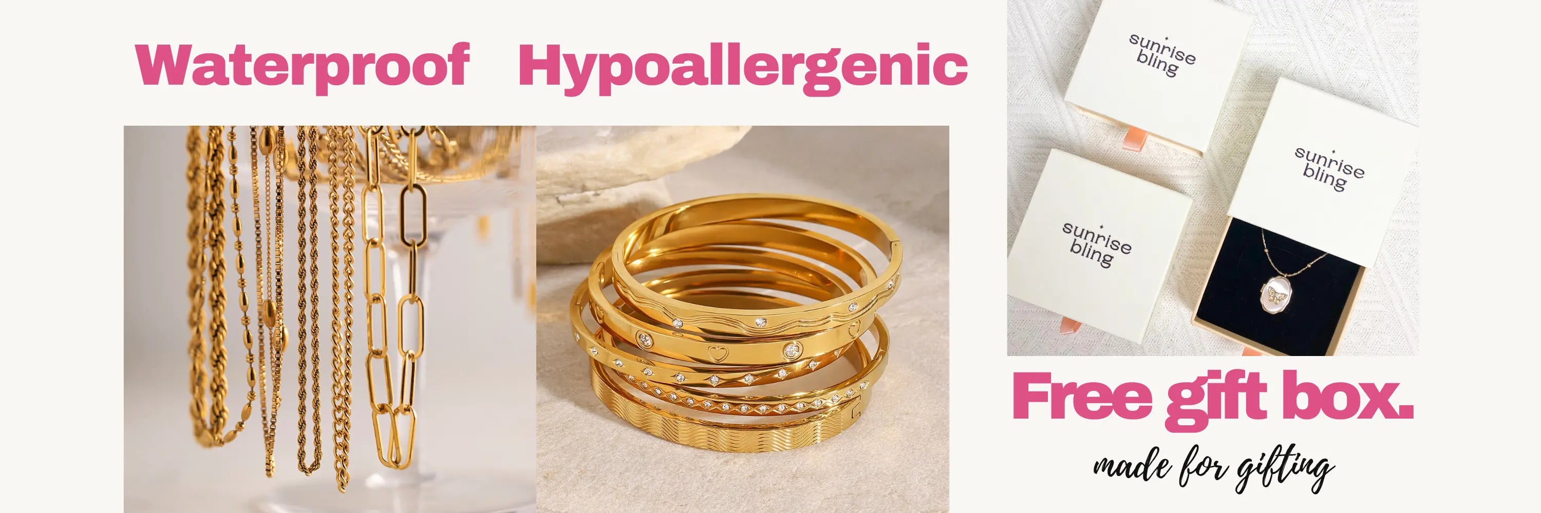 Each Sunrise Bling piece is waterproof, sweatproof, hypoallergenic, tarnish-free, and cosmetic-friendly.