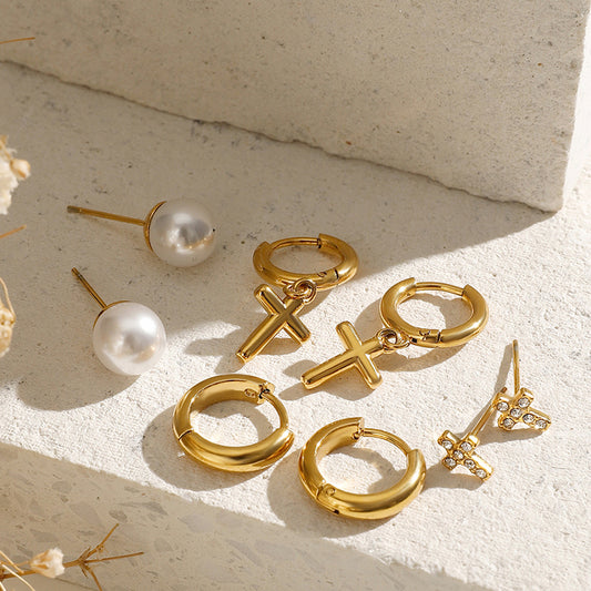 18K Gold Cross Small Hoop Huggie Earrings Set