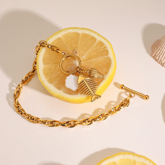 18K Gold Coastline Shell Fishbone Toggle Chain Charm Bracelet