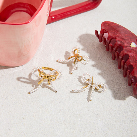 18K Gold Delicate Coquette Bow Pearl Stud Earrings