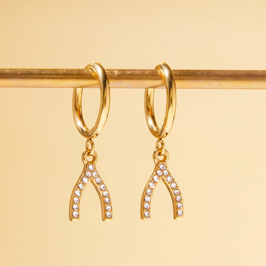 18K Gold Bling Wishing Bone Small Hoop Huggie Earrings with Charm