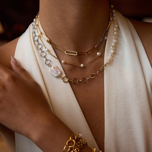 18K Gold Two Tone Chunky Beaded Pearl Paperclip Chain Layered Necklace Set