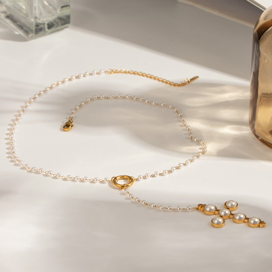 18K Gold Pearl Cross Pendant Lariat Necklace