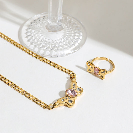 18K Gold Crystal Kiss Flower Pendant Lariat Layered Necklace Set