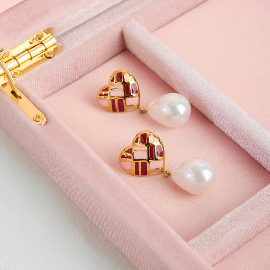 18K Gold Crimson Kiss Heart Stud Dangle Pearl Earrings
