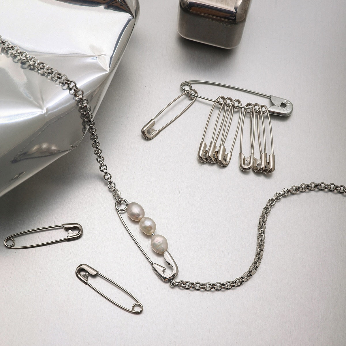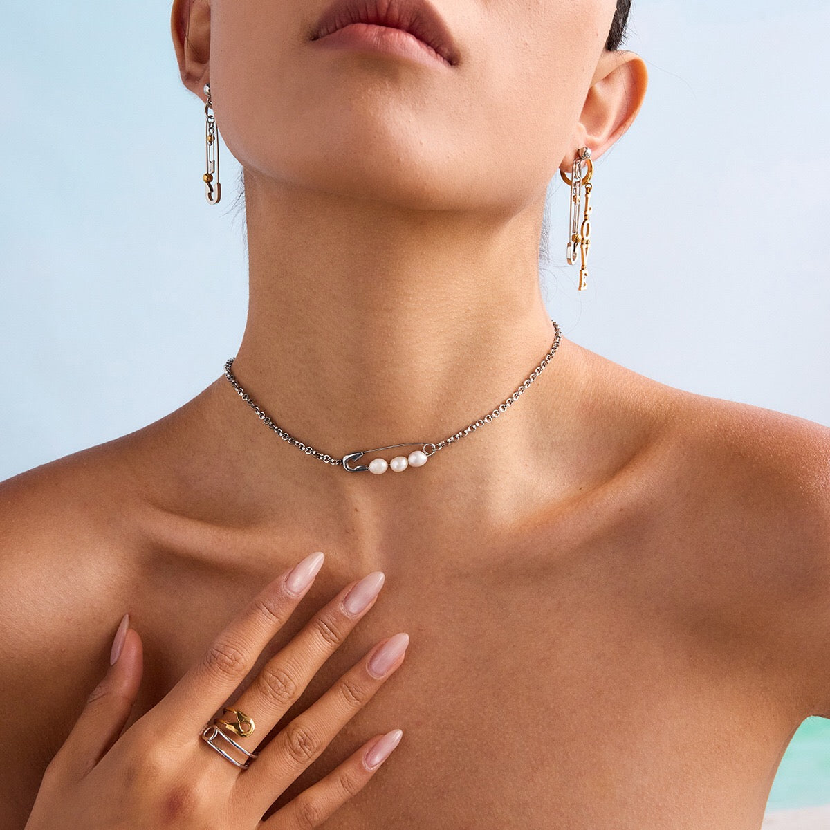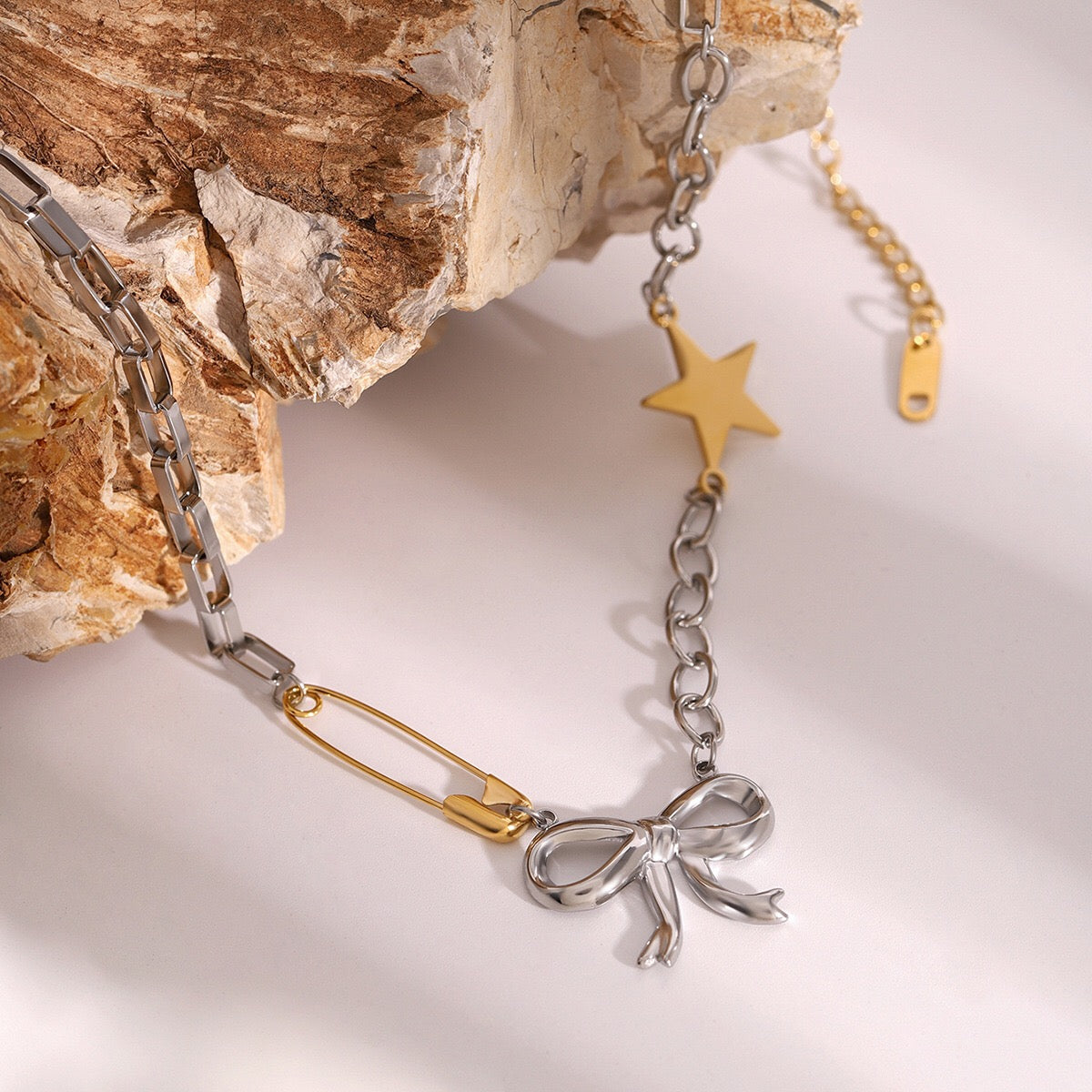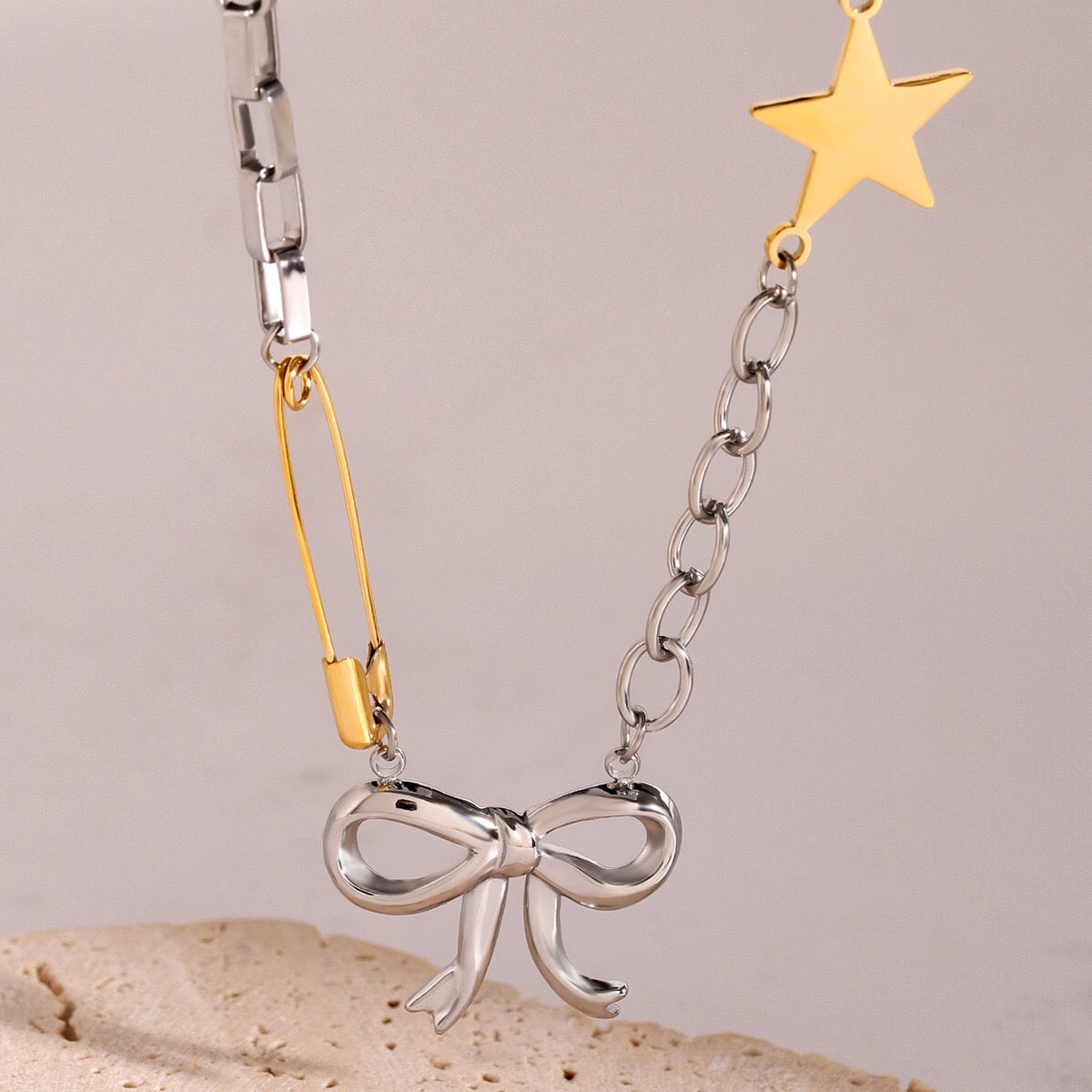 Add a sparkling touch to your look with this super chic 18K Gold and Silver Starry Bow Pendant Pearl Safety Pin Chain Layered Necklace Set. Perfect for the silver-loving girlie who loves to shine! This trendy layered necklace is waterproof and tarnish-free, making it a hassle-free gift your girlfriend will adore. Shine bright and layer up—shop now to glam up your style effortlessly!