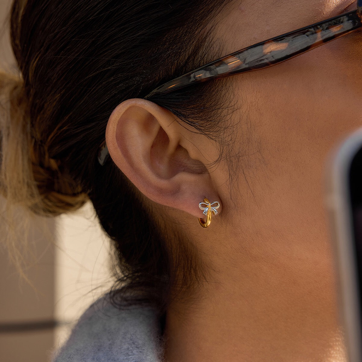 18K Gold and Silver Two Tone Bow Small Hoop Huggie Earrings