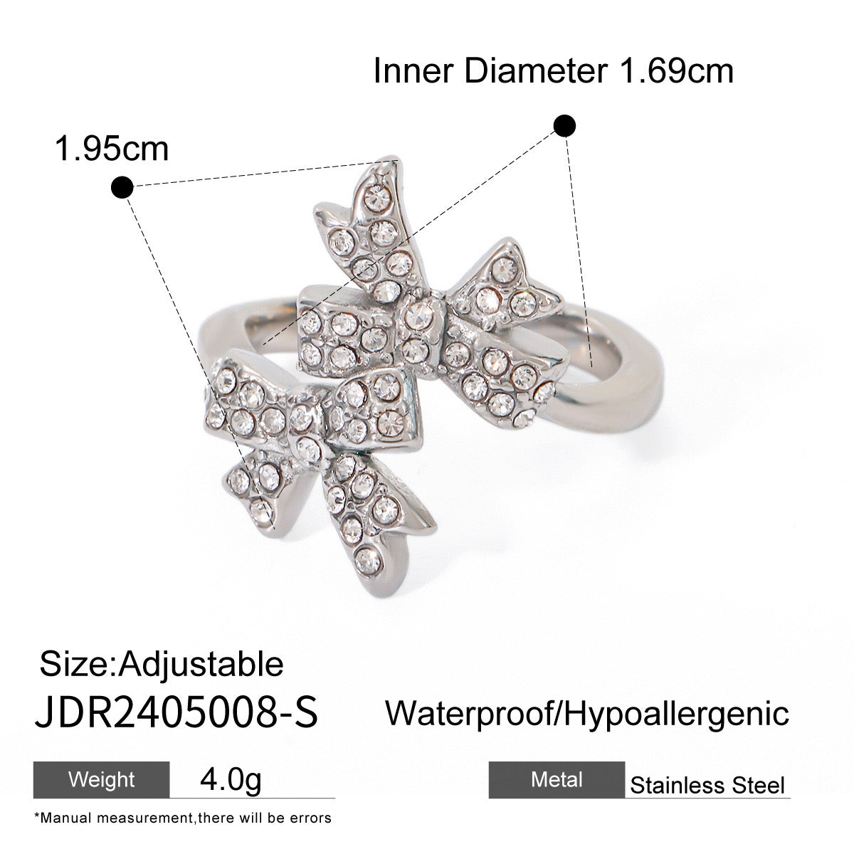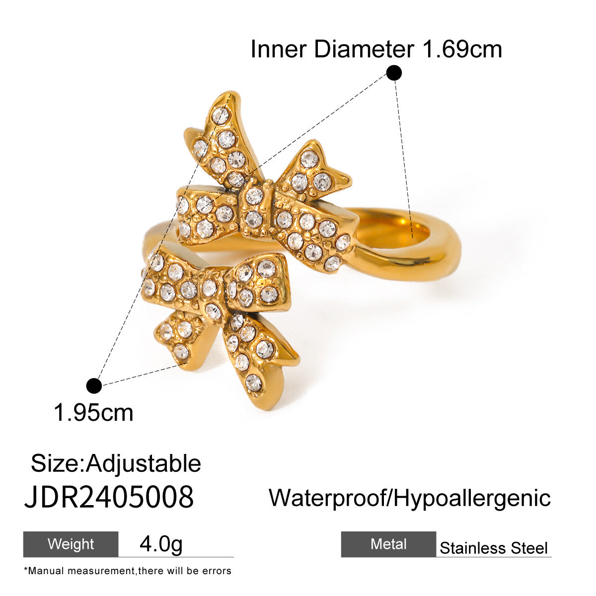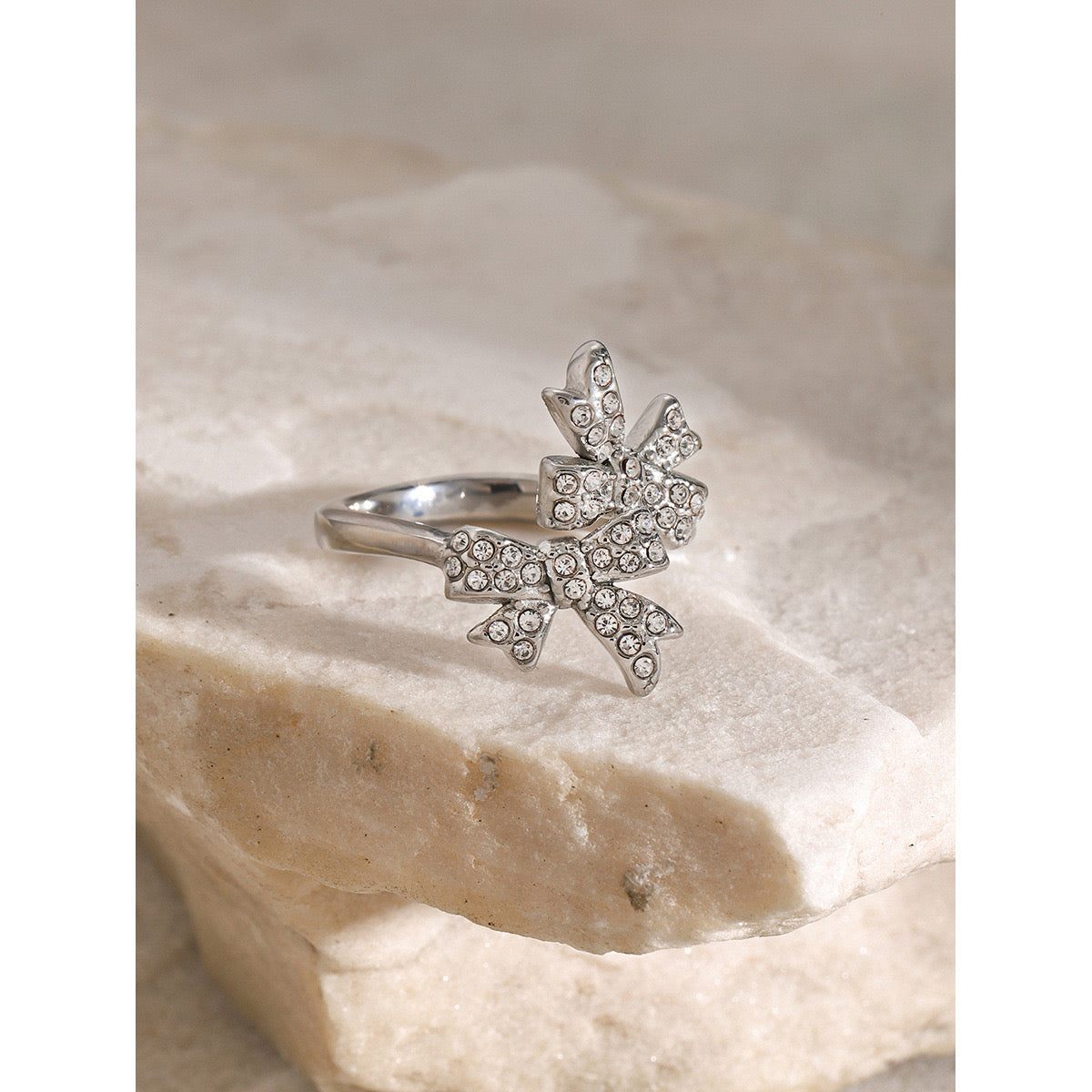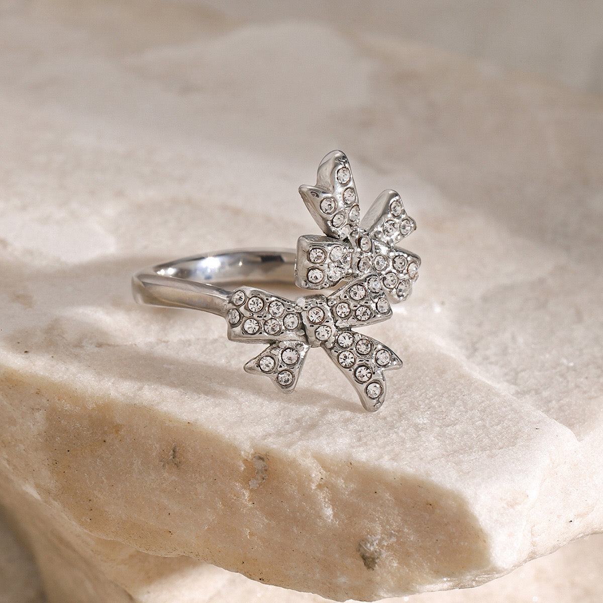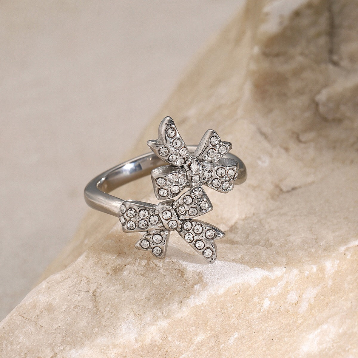 Wrap your finger in fancy with our 18K Gold Bejeweled Coquette Bow Ring! This adorable sparkler brings major luxury vibes in your choice of gold or silver. The dainty bow design screams "I'm expensive" (but shhh, we won't tell). Size-adjustable for that perfect fit, plus it's waterproof and tarnish-free for worry-free wear! Perfect for gifting to your bestie or girlfriend—or treating yourself because, hello, you deserve it! Your jewelry box is literally begging for this cutie.