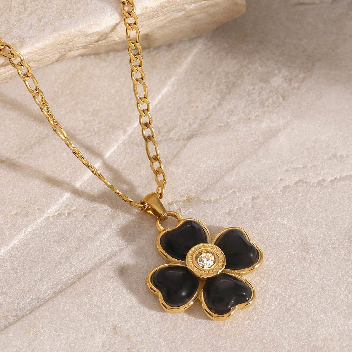 18K Gold Black Heart Clover CZ Pendant Figaro Chain Statement Necklace