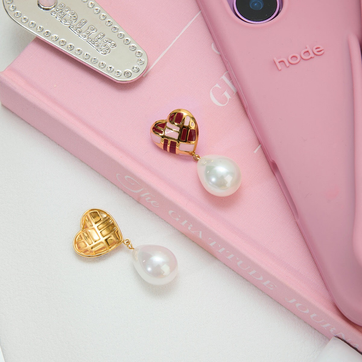 18K Gold Crimson Kiss Heart Stud Dangle Pearl Earrings