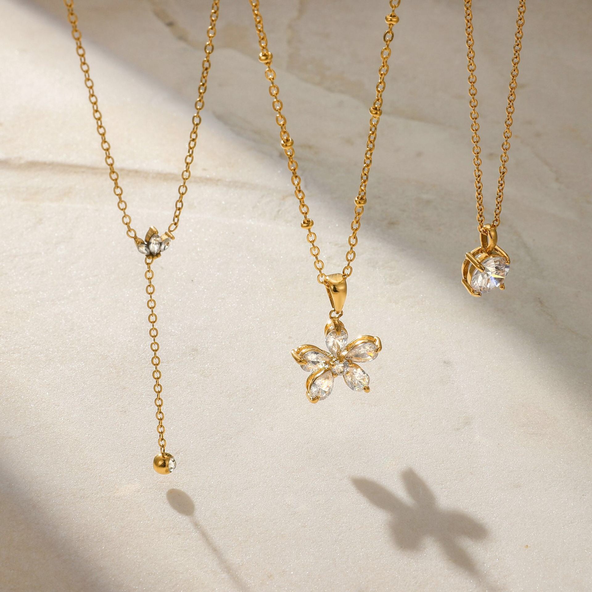 Elevate her style with the 18K Gold Crystal Kiss Flower Pendant Lariat Necklace Set, a chic and trendy touch of luxury. Sparkling crystals and layered design make it irresistibly bling, perfect for your stylish wife. Waterproof and tarnish-free, it stays radiant day after day. Show your love with this dazzling giftāshop now and make her shine!