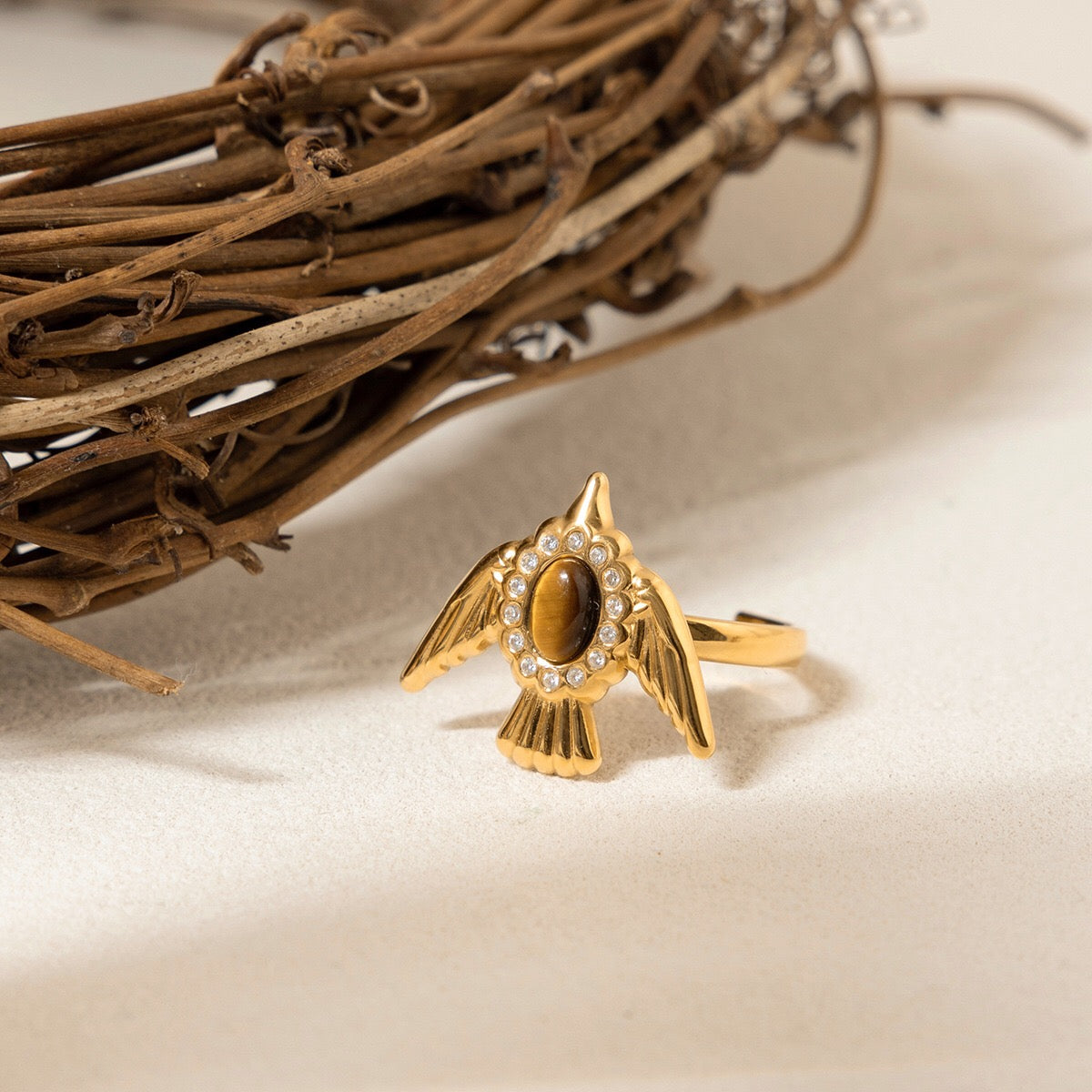 18K Gold Free Spirit Tiger Eye Bird Ring