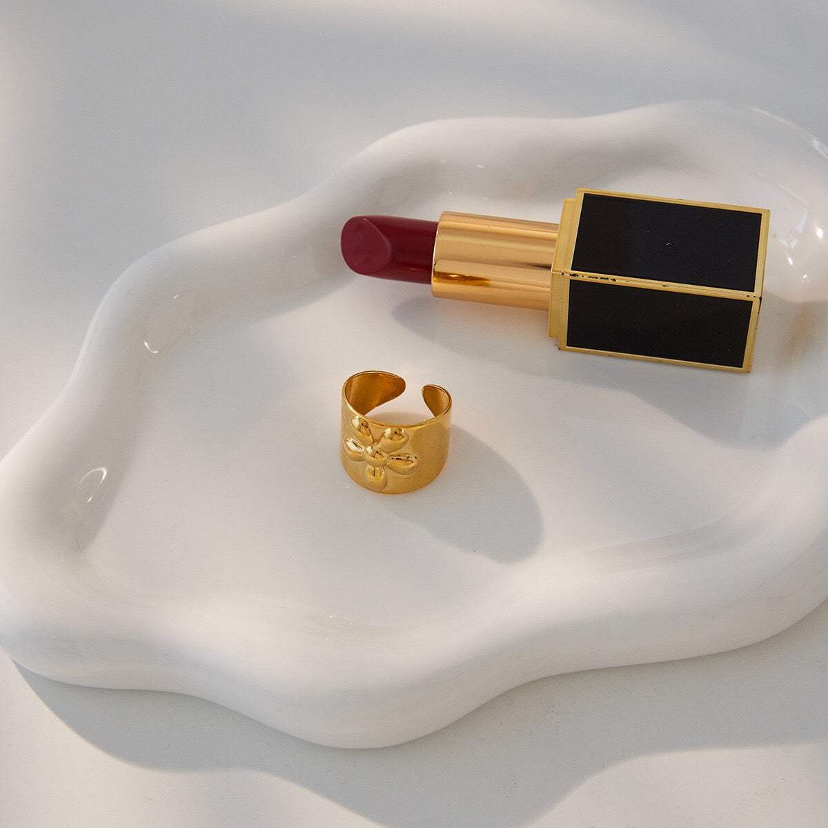 Surprise your bestie with this gorgeous 18K Gold Gentle Strength Flower Statement Band Ring—a chic and trendy piece that screams sophistication! Featuring a stunning floral design that commands attention, this ring combines beauty with brains: waterproof construction and non-tarnish technology mean it stays flawless through all her adventures. Whether she's conquering the world or just living her best life, this statement band adds that perfect touch of elegance to any look. A gift she'll absolutely love. Shop now!