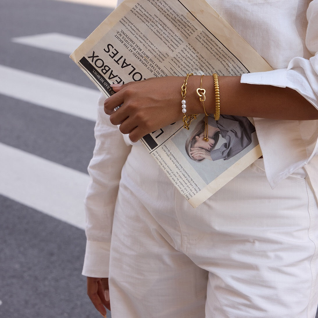 Bring chic elegance to any look with the 18K Gold Golden Haze Pearl Chain Bangle Bracelet Stack. Waterproof and tarnish-free, this must-have accessory keeps its glow no matter the day. The perfect gift to surprise your girlfriend with style sheāll adore. Donāt miss outāshop now and add a sparkling touch to her collection!