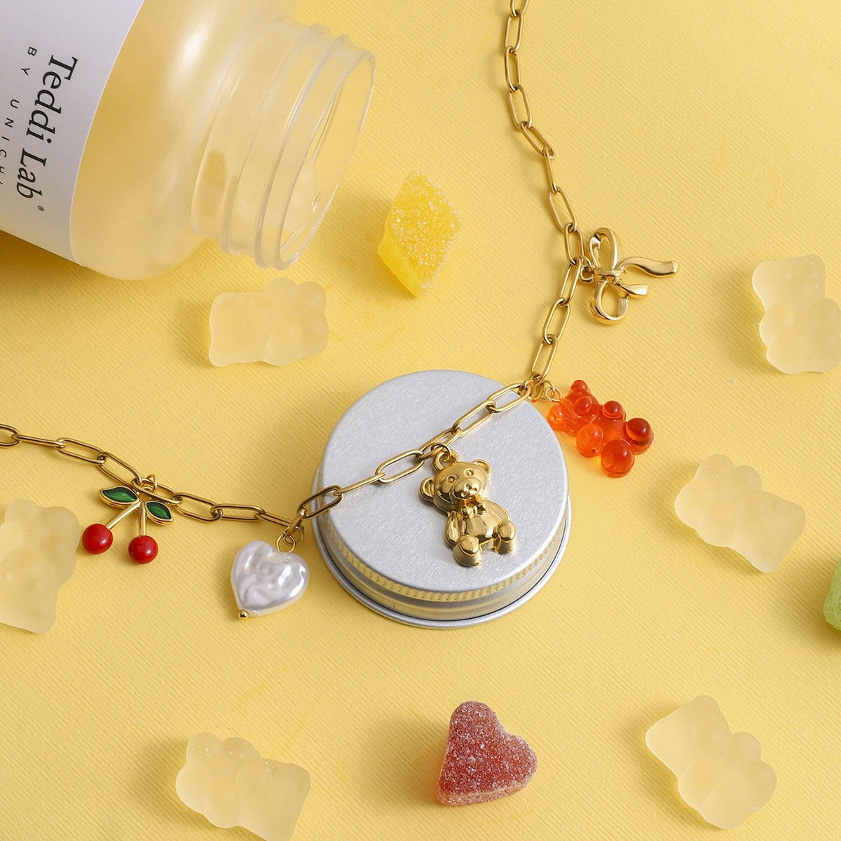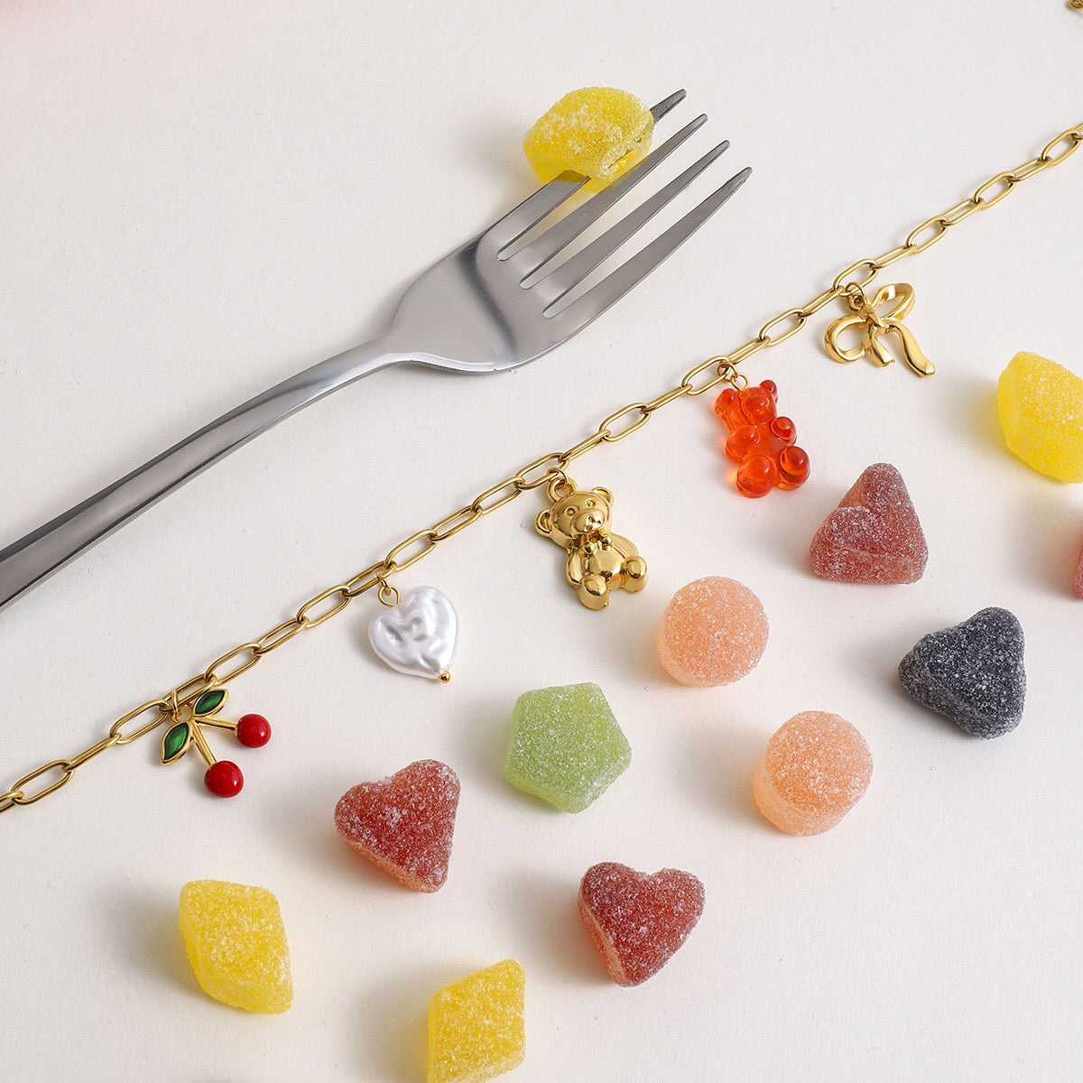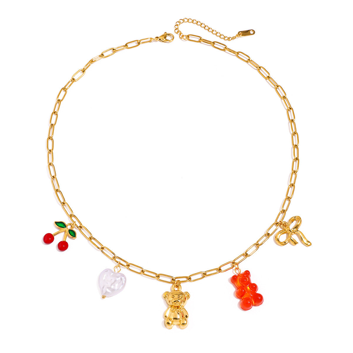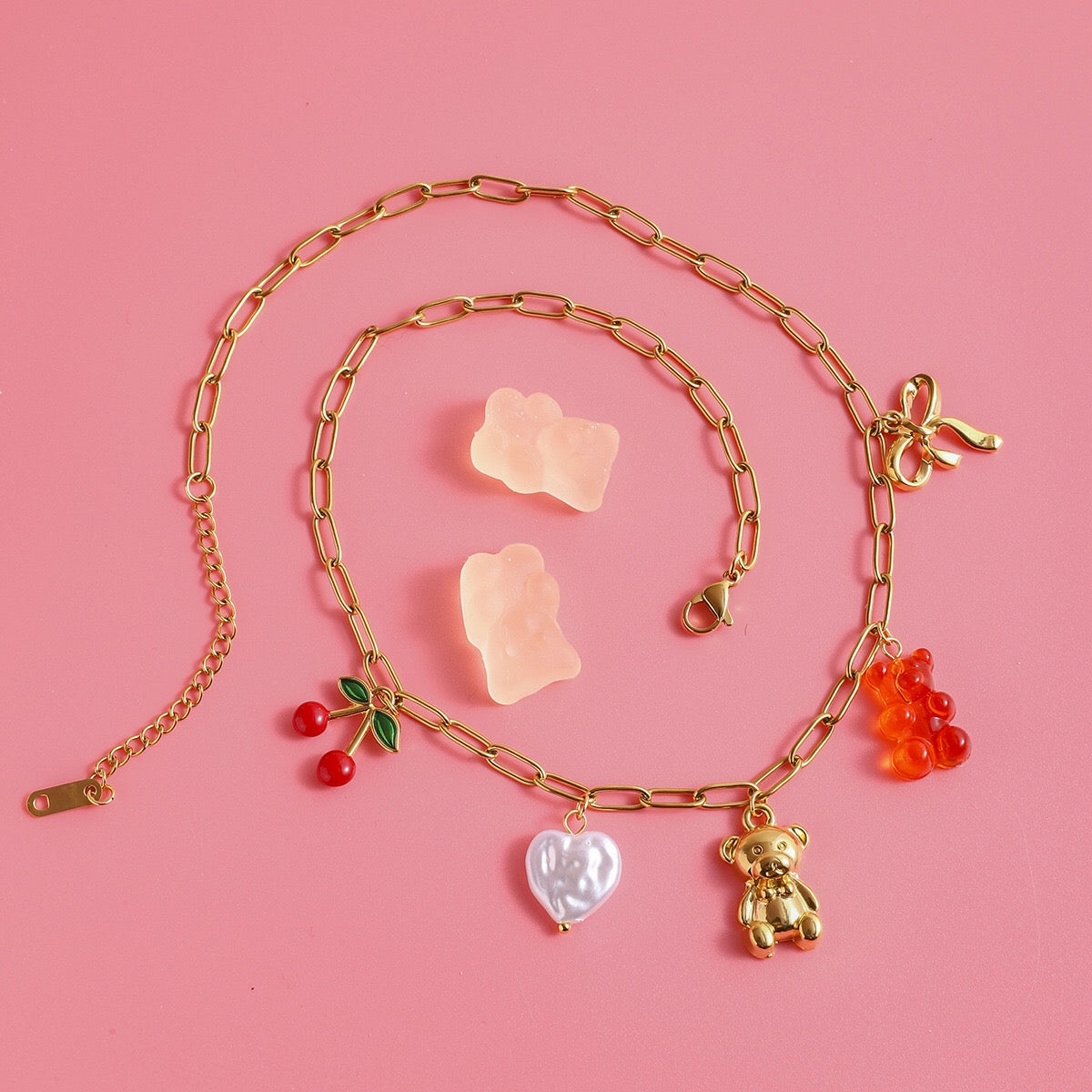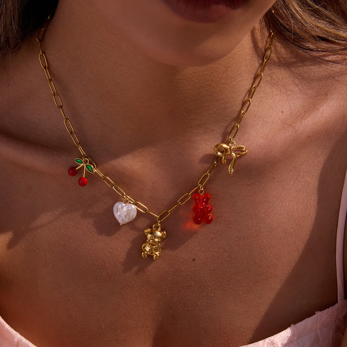 18K Gold Gummy Bear Cute Bow Cherry Paperclip Chain Charm Necklace