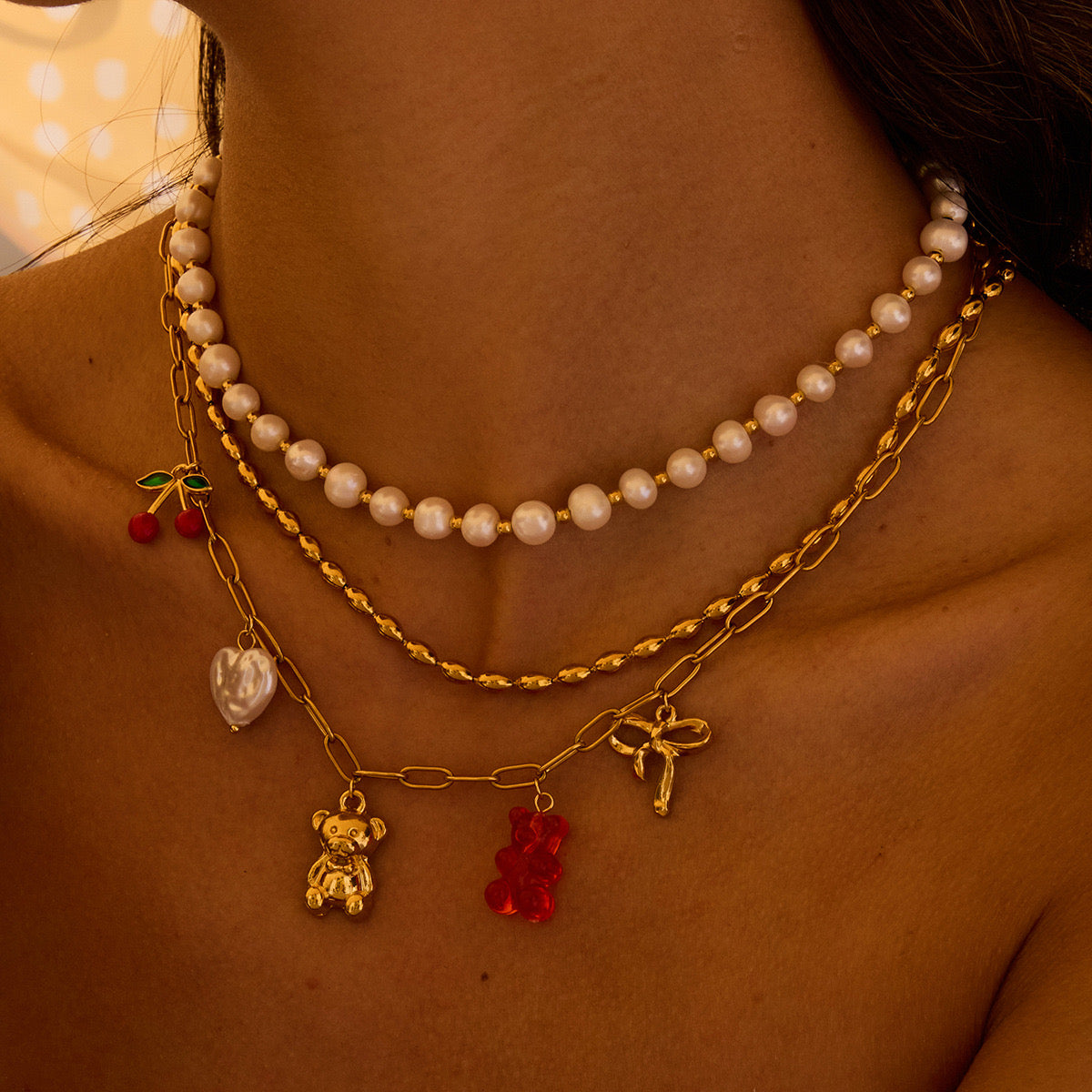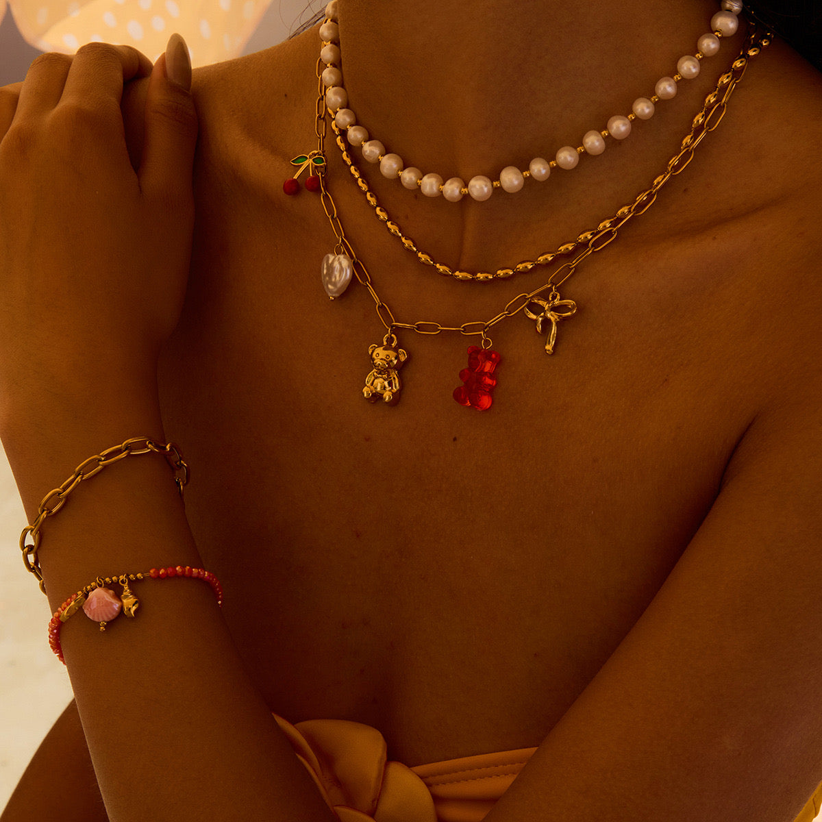 Looking for a trendy and unique accessory to add to your summer wardrobe? Look no further than our 18K Gold Gummy Bear Necklace! This cute and chic piece is perfect for any summer outfit and is waterproof and anti-tarnish for long-lasting wear. Whether for yourself or a loved one, this vibrant necklace is a must-have. Shop now and add some playful charm to your style!