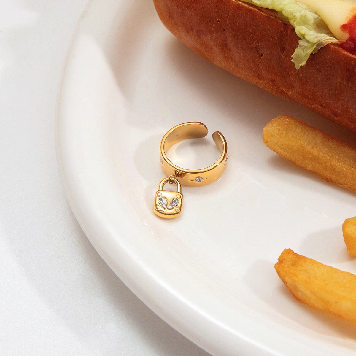 Add a touch of chic luxury to her style with this 18K Gold Heart Locked Charm Statement Band Ring. Waterproof and tarnish-free, it’s perfect for everyday sparkle without the worry. The ideal gift for your girlfriend, this must-have ring combines trendy charm with lasting shine. Shop now and let her shine bright!