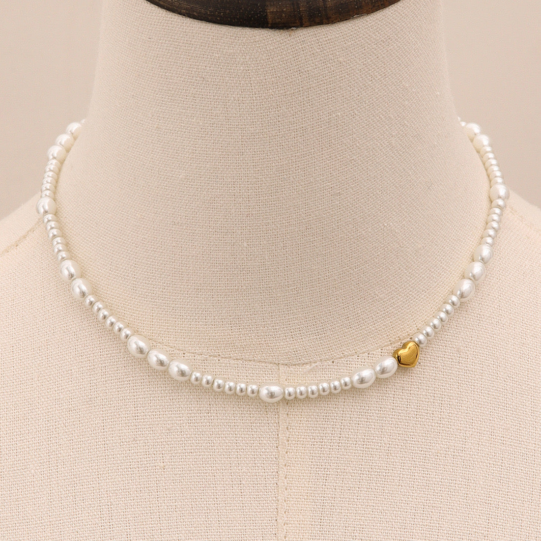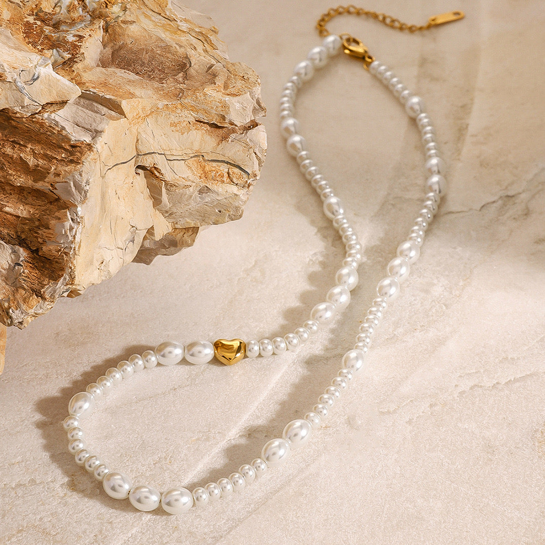 18K Gold Heart Pearl Chain Beaded Collar Necklace