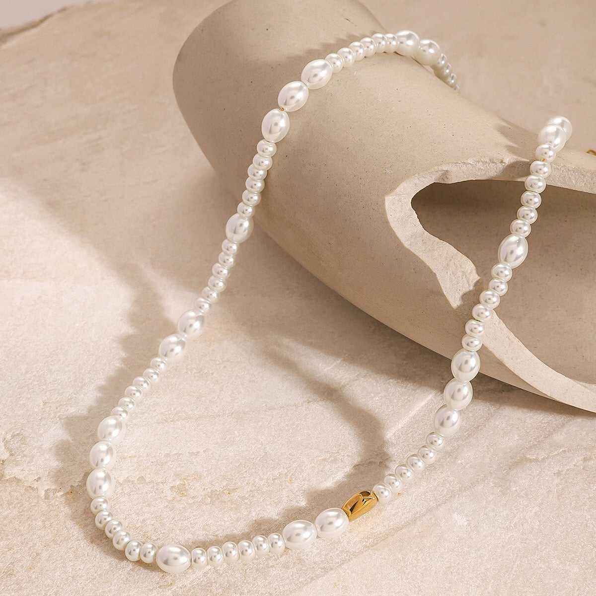 Tie your look together with our elegant and trendy 18K Gold Heart Pearl Chain Necklace. With its eye-catching gold heart and delicate pearl beaded chain, this must-have accessory is the perfect gift for your wife, girlfriend, mom, or loved ones. Shop now and add a touch of love to any outfit.