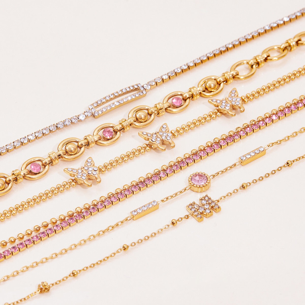 18K Gold Luxury Pink Butterfly Dainty Tennis Chain Bracelet Stack