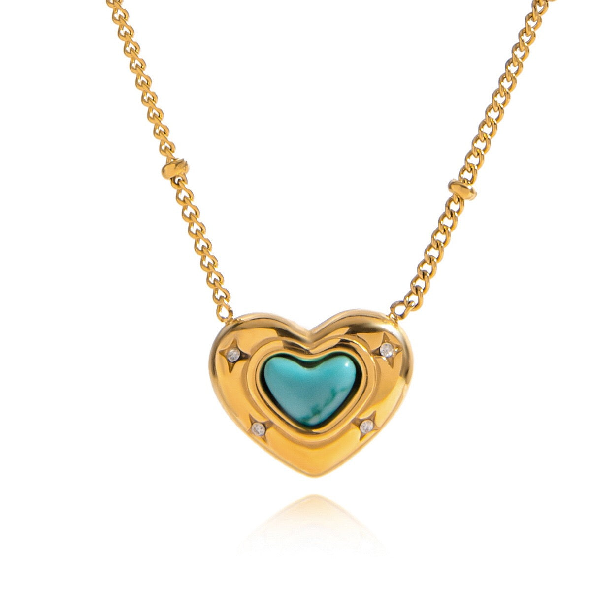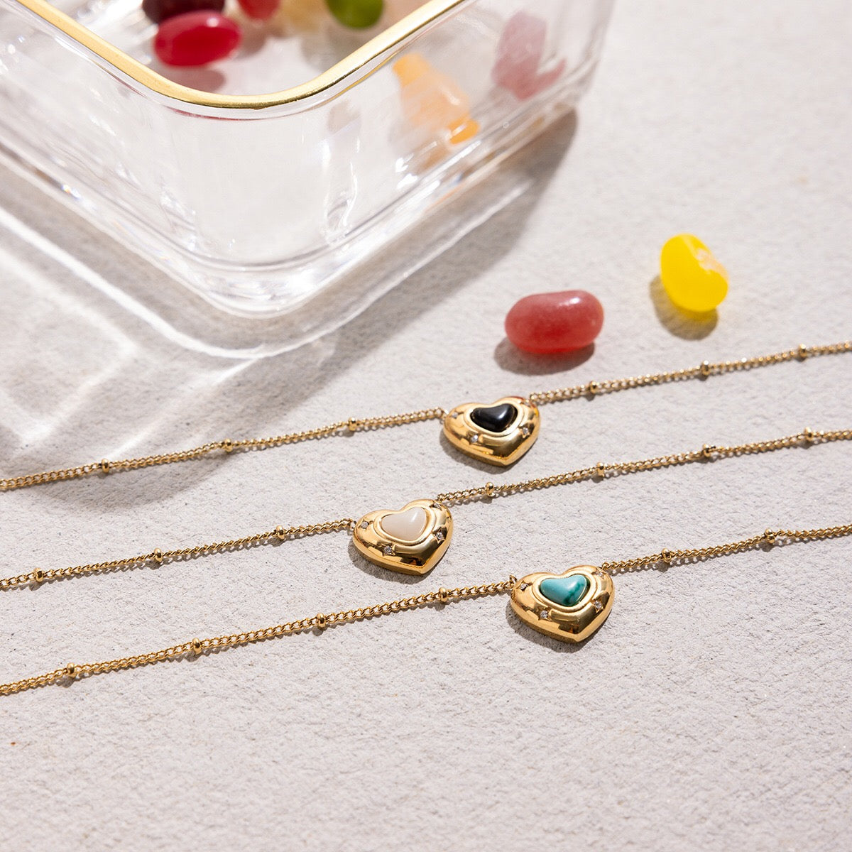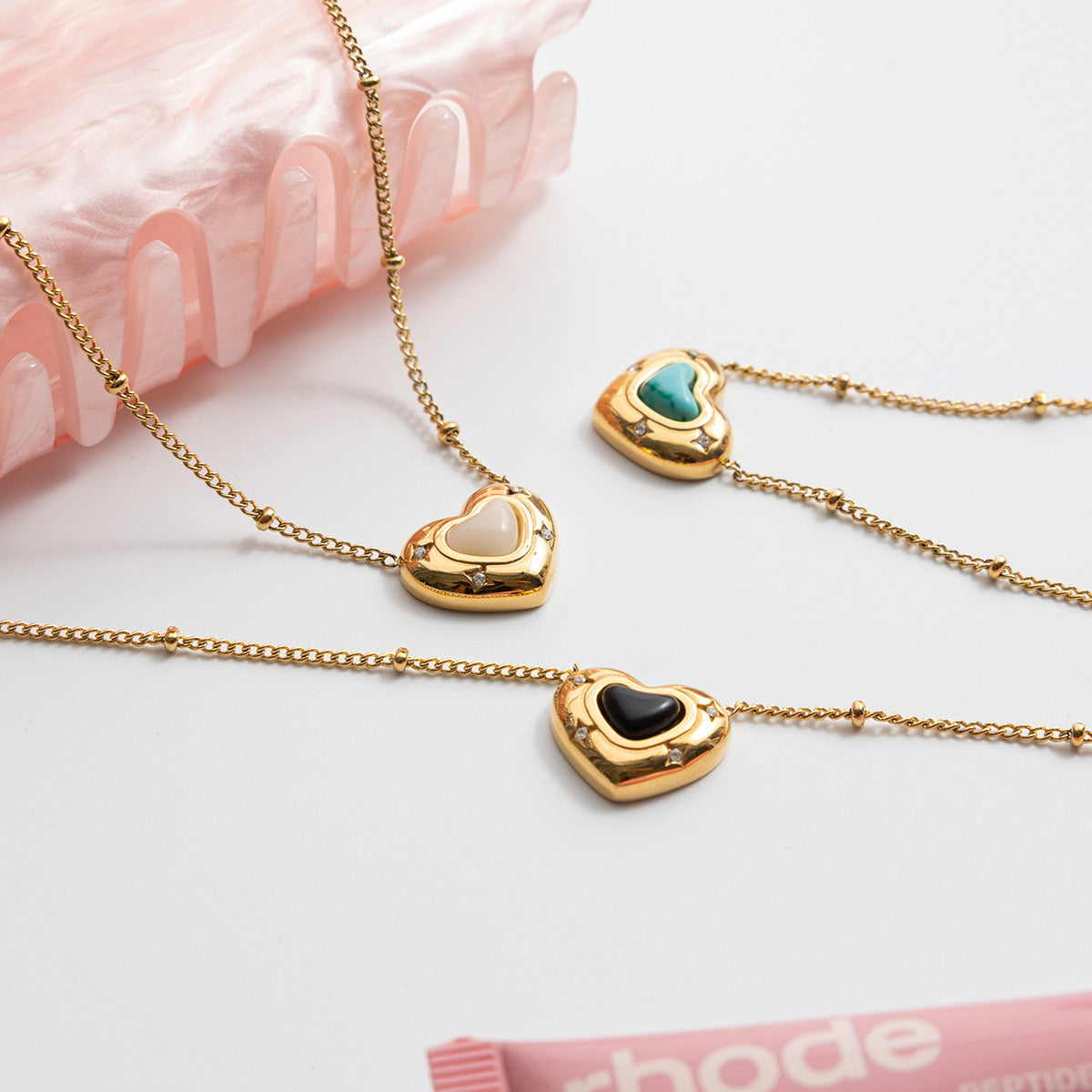 18K Gold Natural Stone Stars Adorned Dainty Heart Pendant Necklace