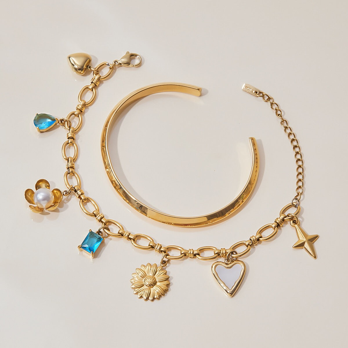Dive into style with the 18K Gold Ocean Blue Charm Bracelet. Sleek, fun, and super chic, this waterproof and tarnish-free bangle stack adds a splash of luxury to any look. It's the perfect gift to surprise your bestie—shop now and brighten up your jewelry collection with a trendy twist!