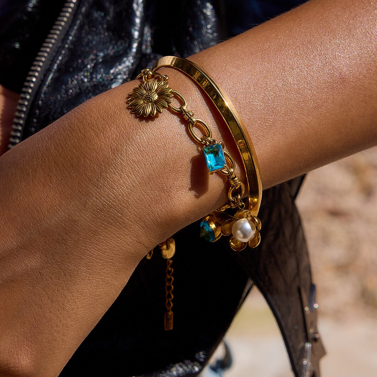 18K Gold Ocean Blue Charm Bracelet Sleek Bangle Stack