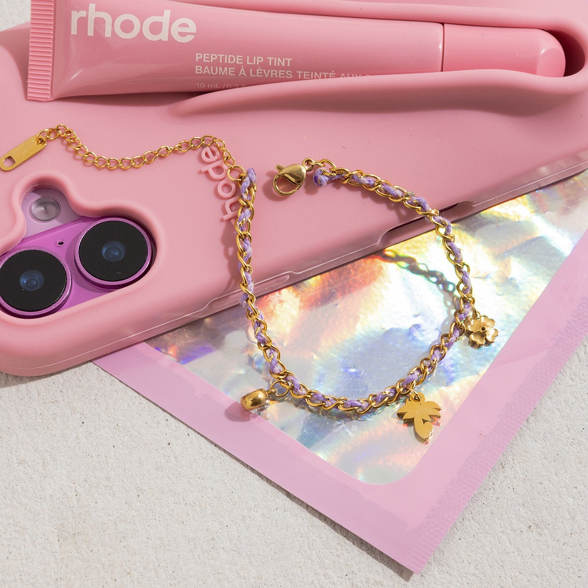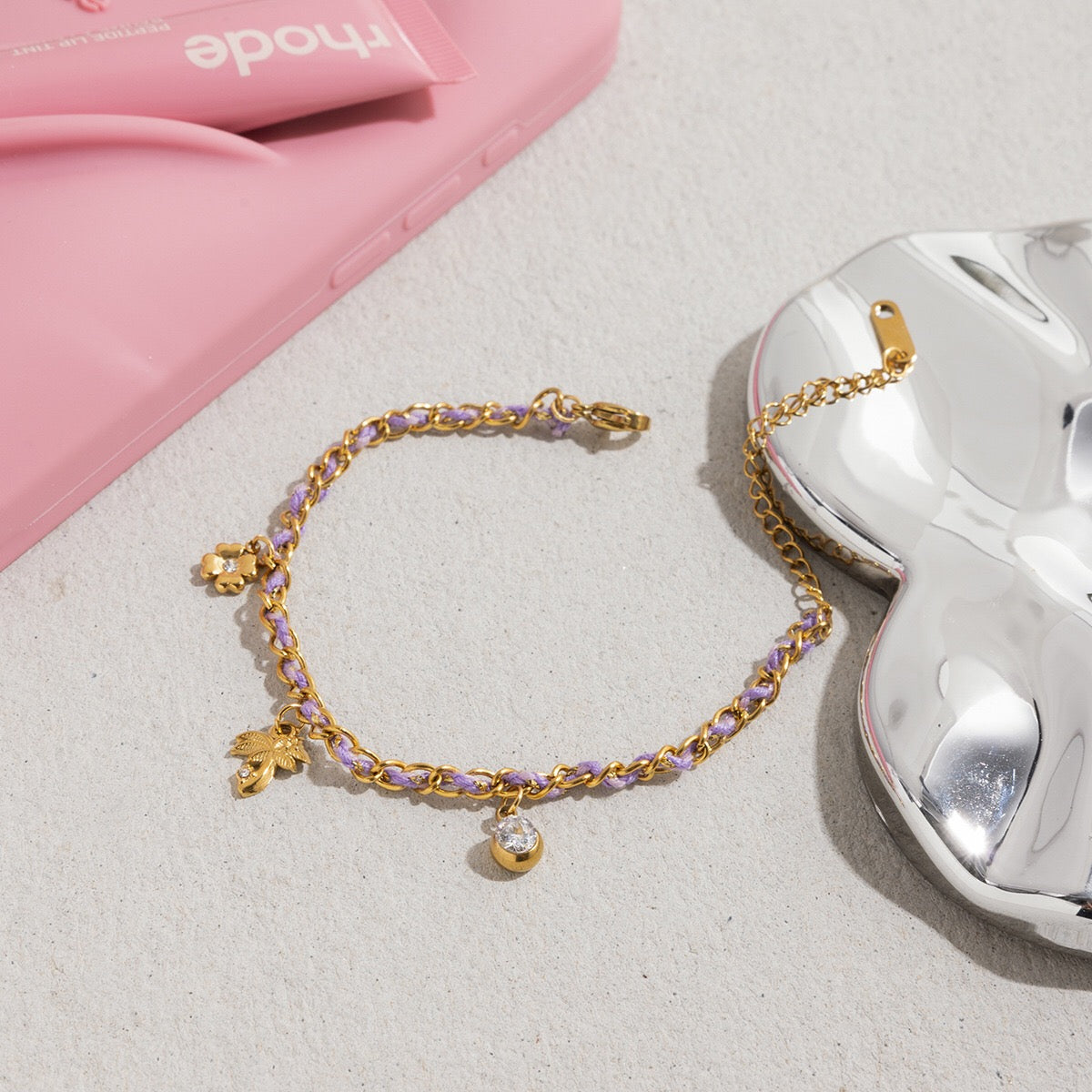 18K Gold Palm Tree Charm Purple Chain Wristband Bracelet Stack