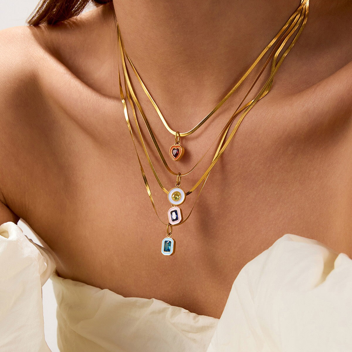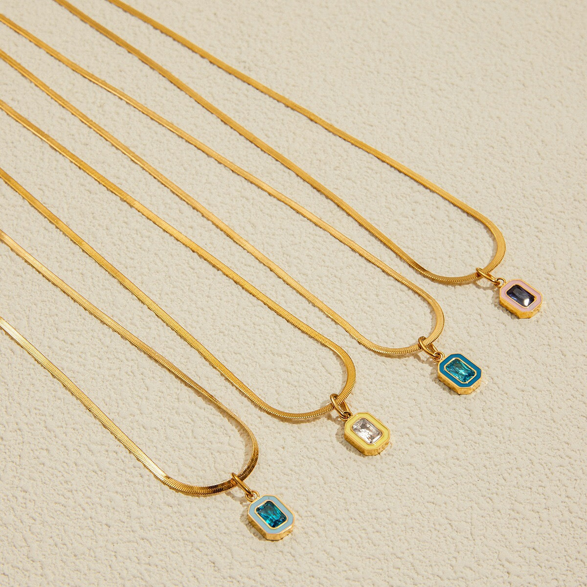 18K Gold Playful Color Birthstone Pendant Herringbone Snake Chain Necklace