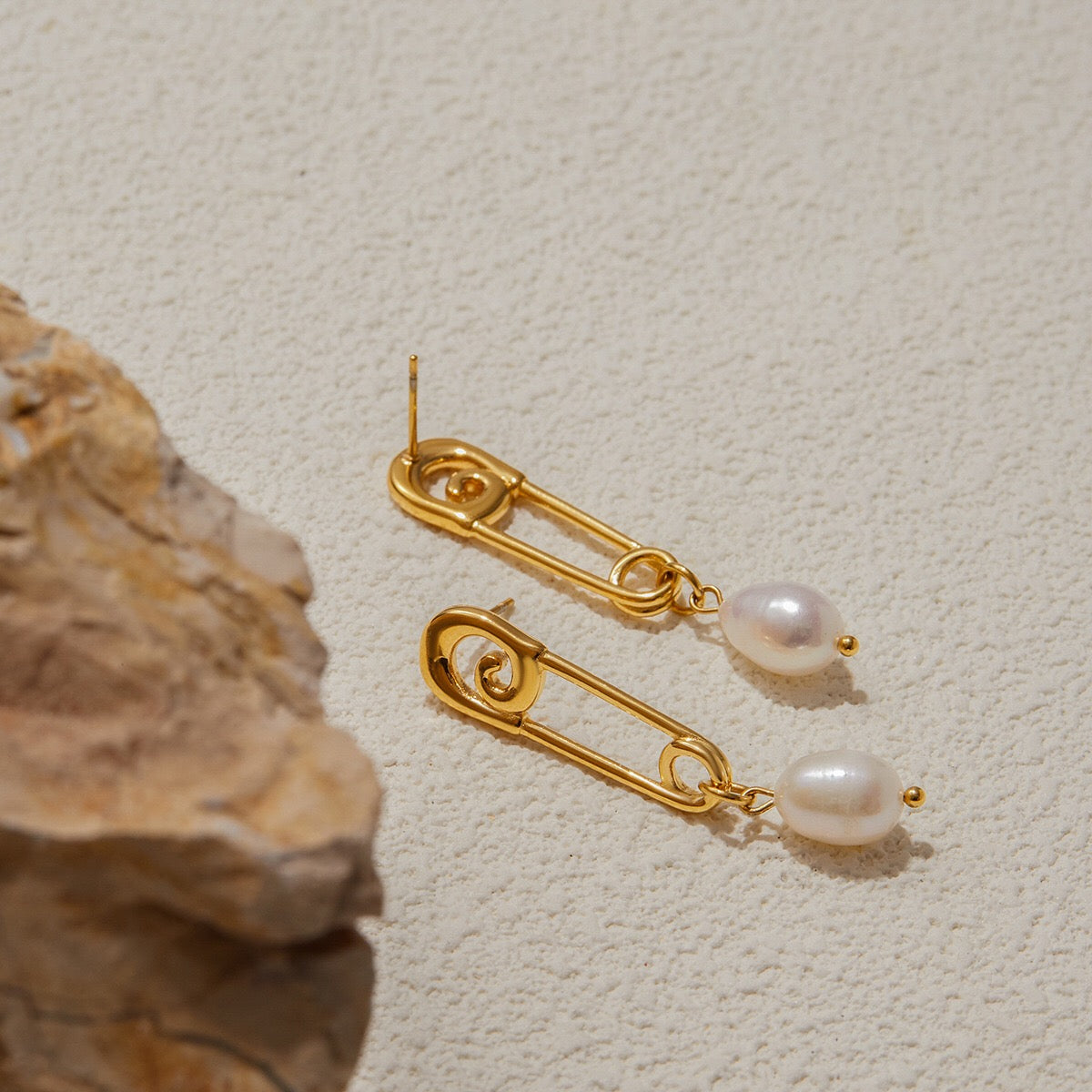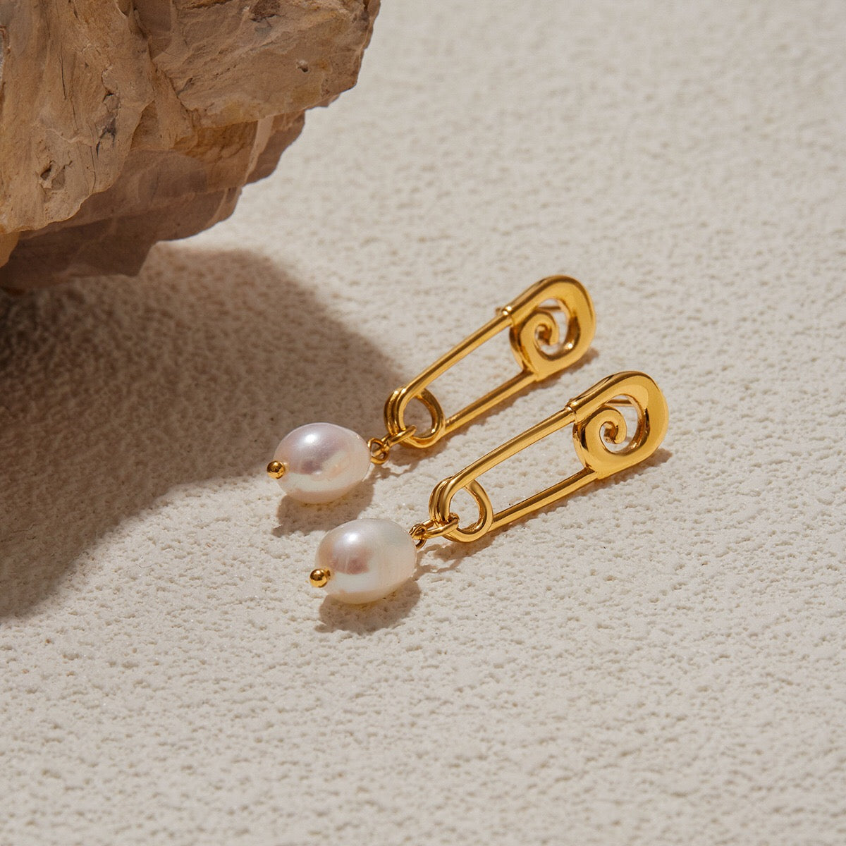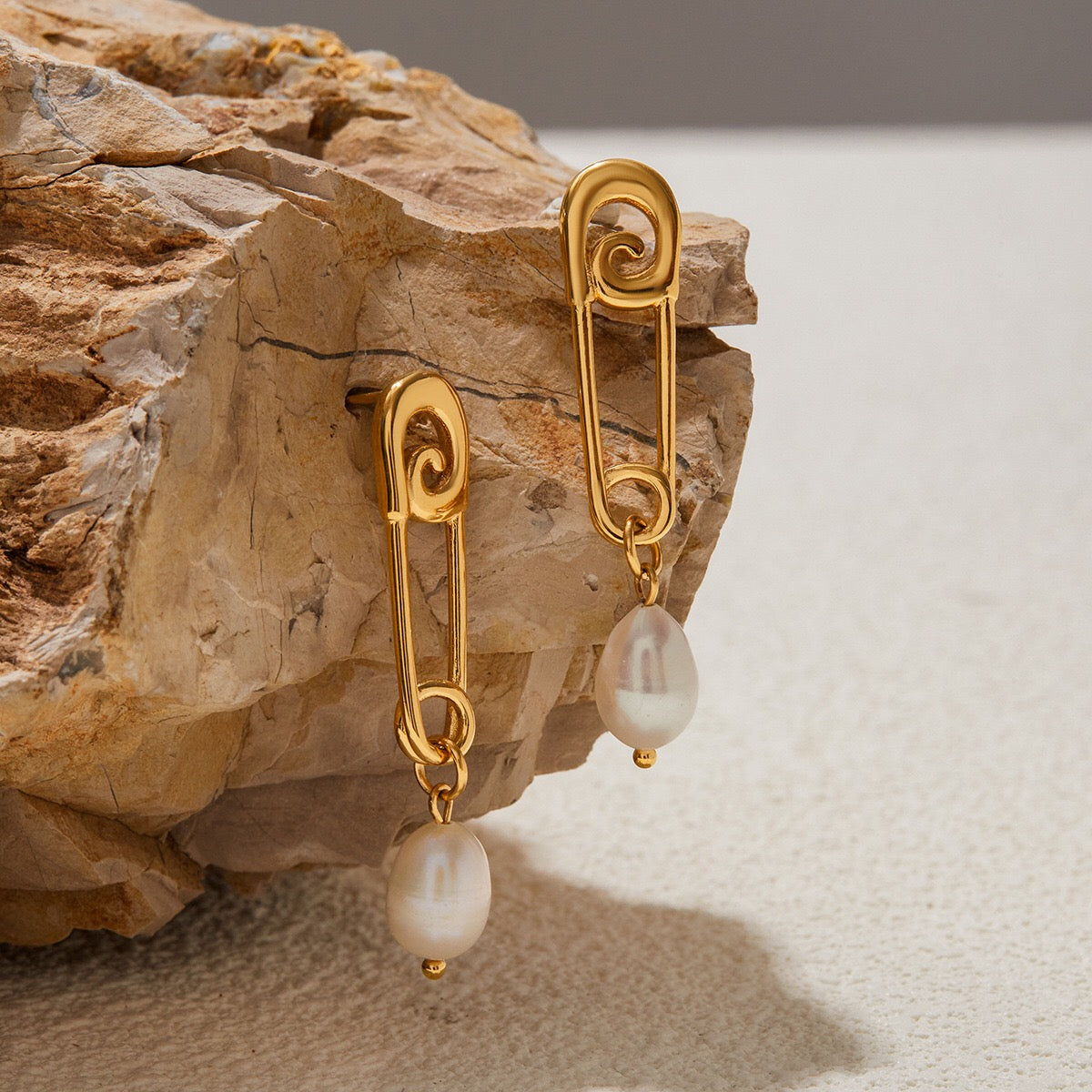 Add a dash of edge and elegance with these 18K Gold Safety Pin Pearl Statement Dangle Stud Earrings. Waterproof and tarnish-free, they keep your style shining no matter the adventure. Perfectly playful and a must-try for fashion lovers, they make an unforgettable gift for your girlfriend. Elevate every look and shop now to sparkle with confidence!