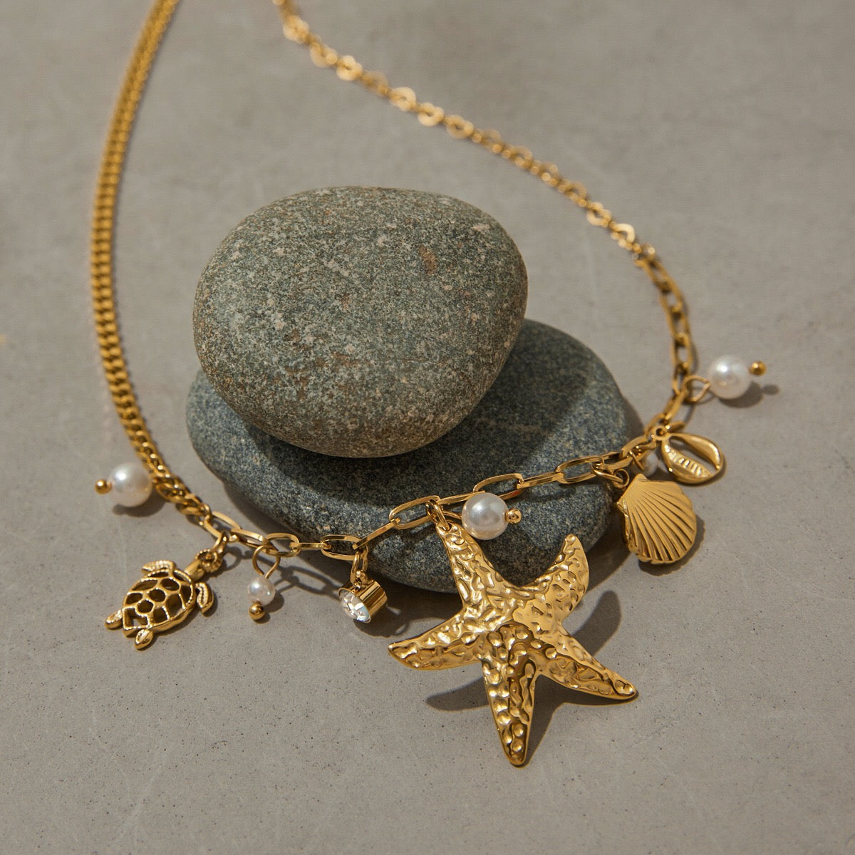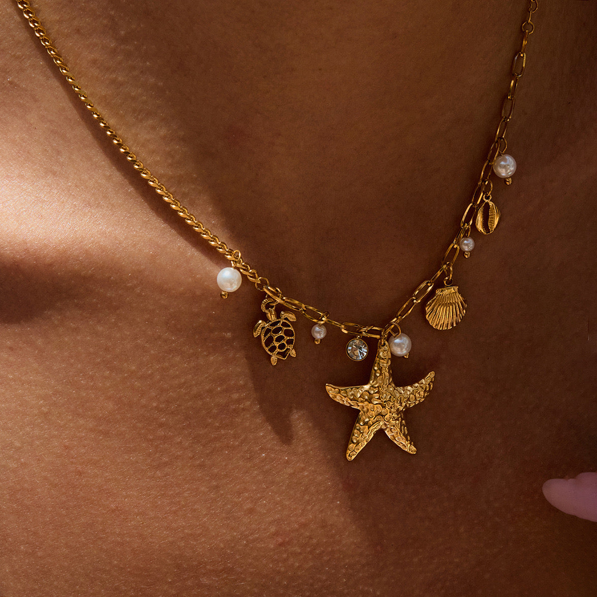 Get ready for summer with our 18K Gold Starfish Beach Pearl Beads Charm Necklace! This stunning piece features ocean-themed charms with lustrous pearl beads. It's waterproof and sweatproof, so you can wear it all day long without worrying about tarnishing. The perfect gift for your loved ones (or yourself!), shop now before it's gone!