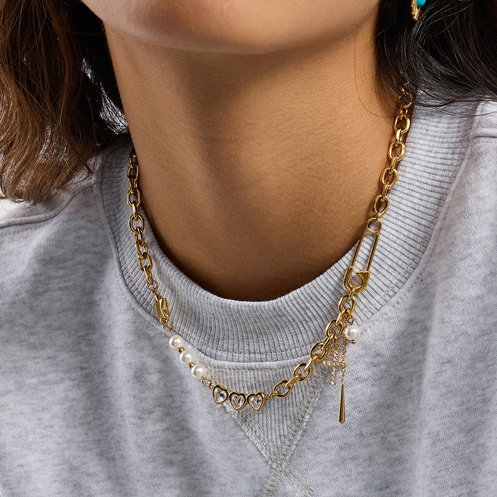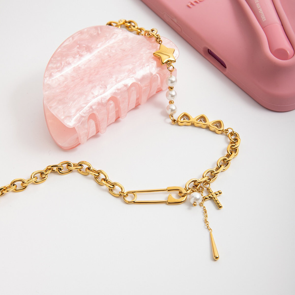 18K Gold Y2K Safty Pin Heart Pearl Cross Chain Necklace