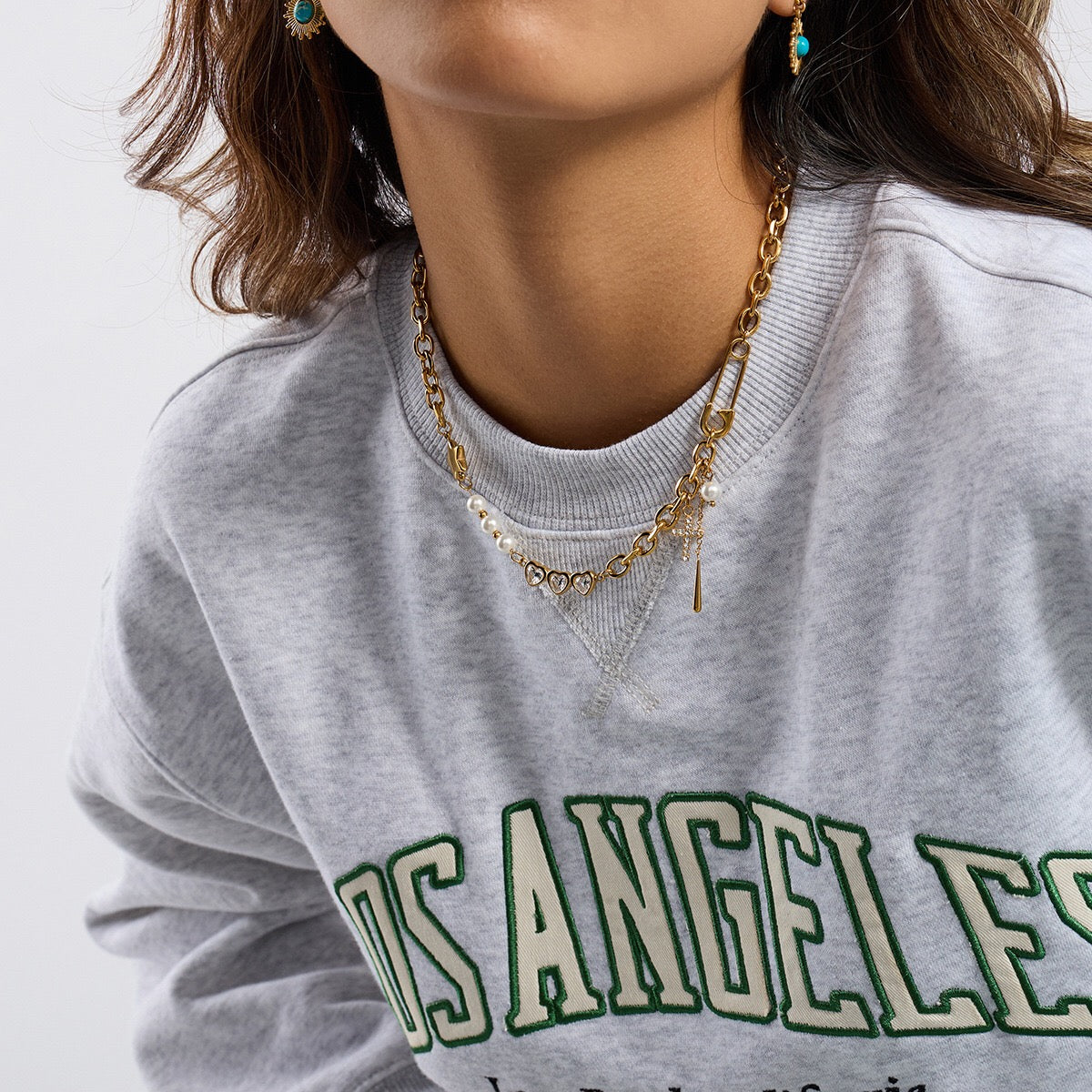 The 18K Gold Y2K Safety Pin Heart Pearl Cross Chain Necklace is very chic and trendy with a touch of edgy attitude. Waterproof and tarnish-free, this must-have piece adds bold style to any outfit. Perfect gift for your best friend who loves to stand out—shop now and make a statement!