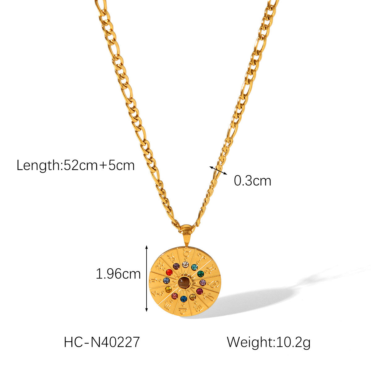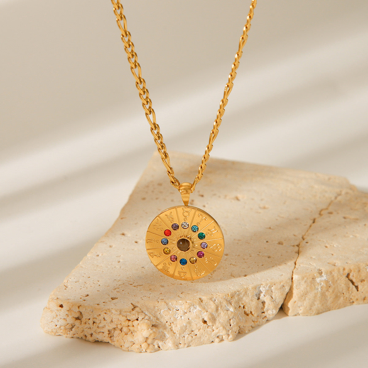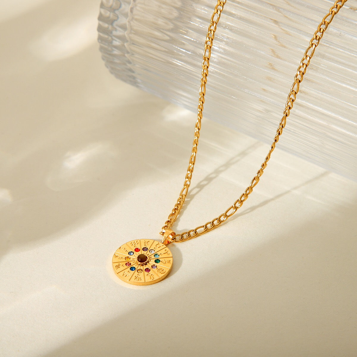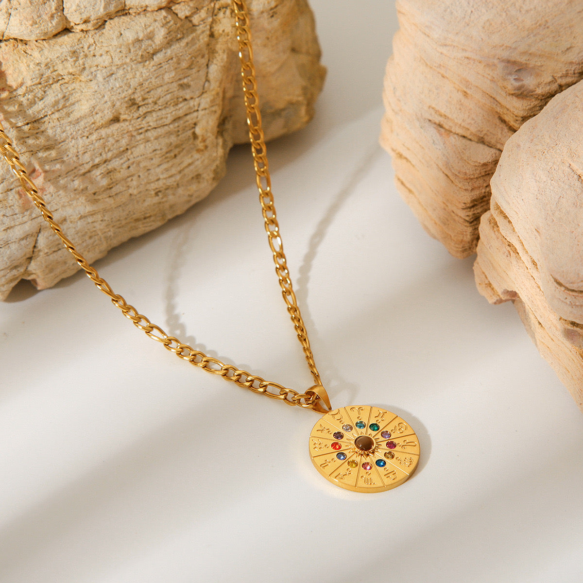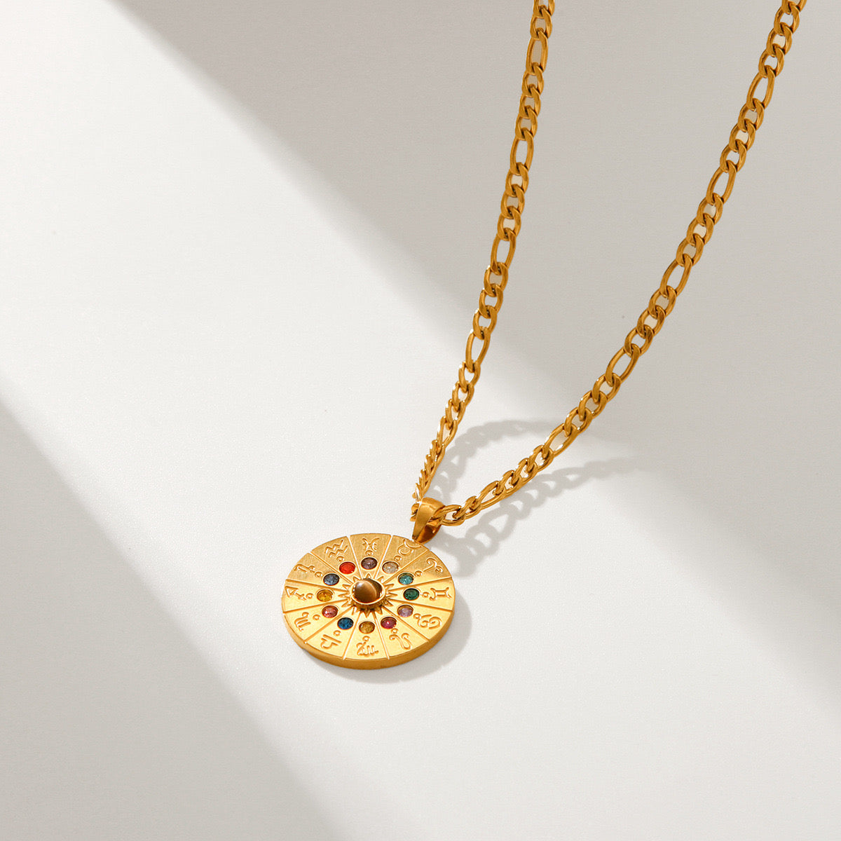18K Gold Zodiac Astrology Coin Pendant Figaro Chain Pendant Necklace